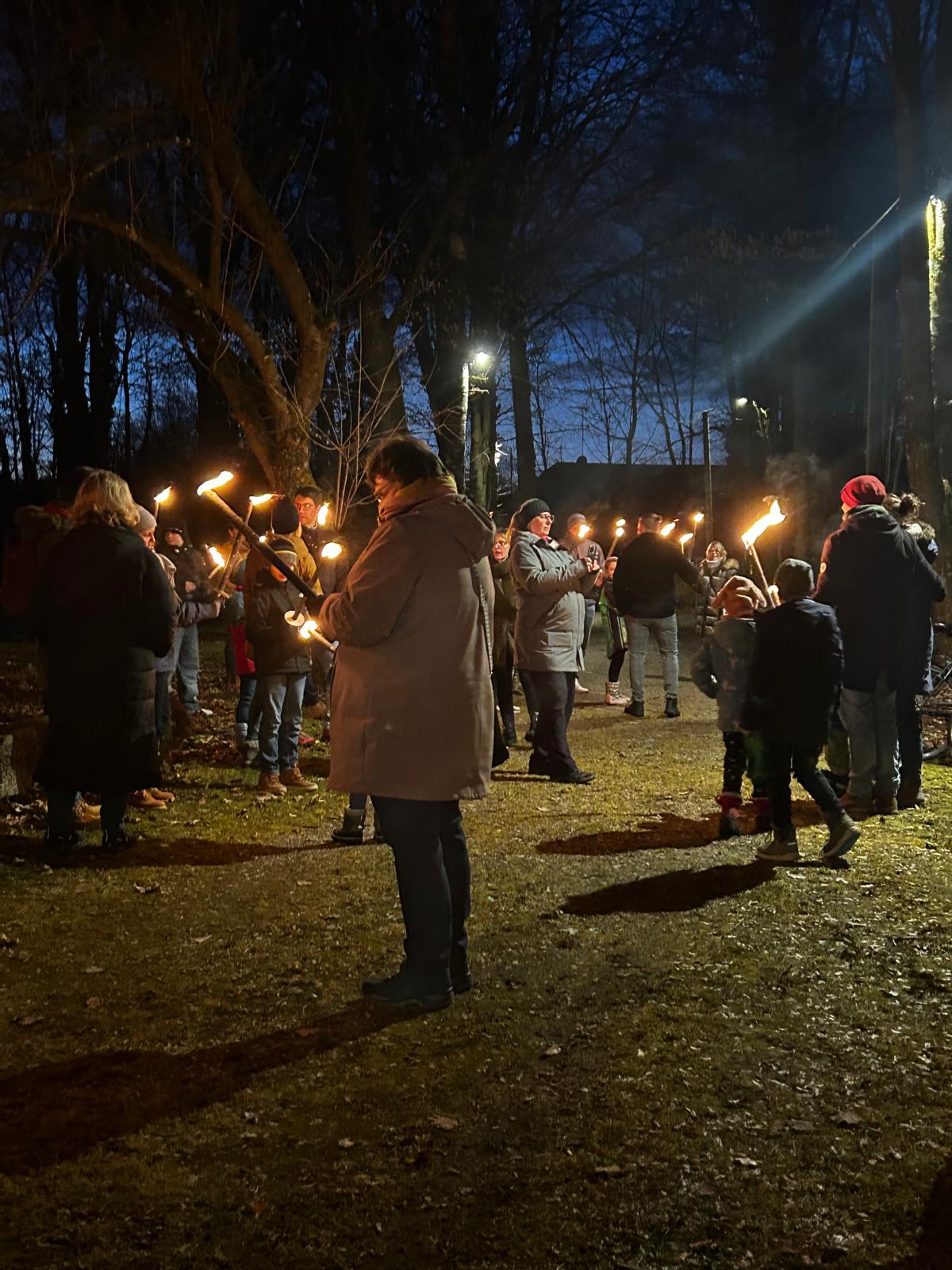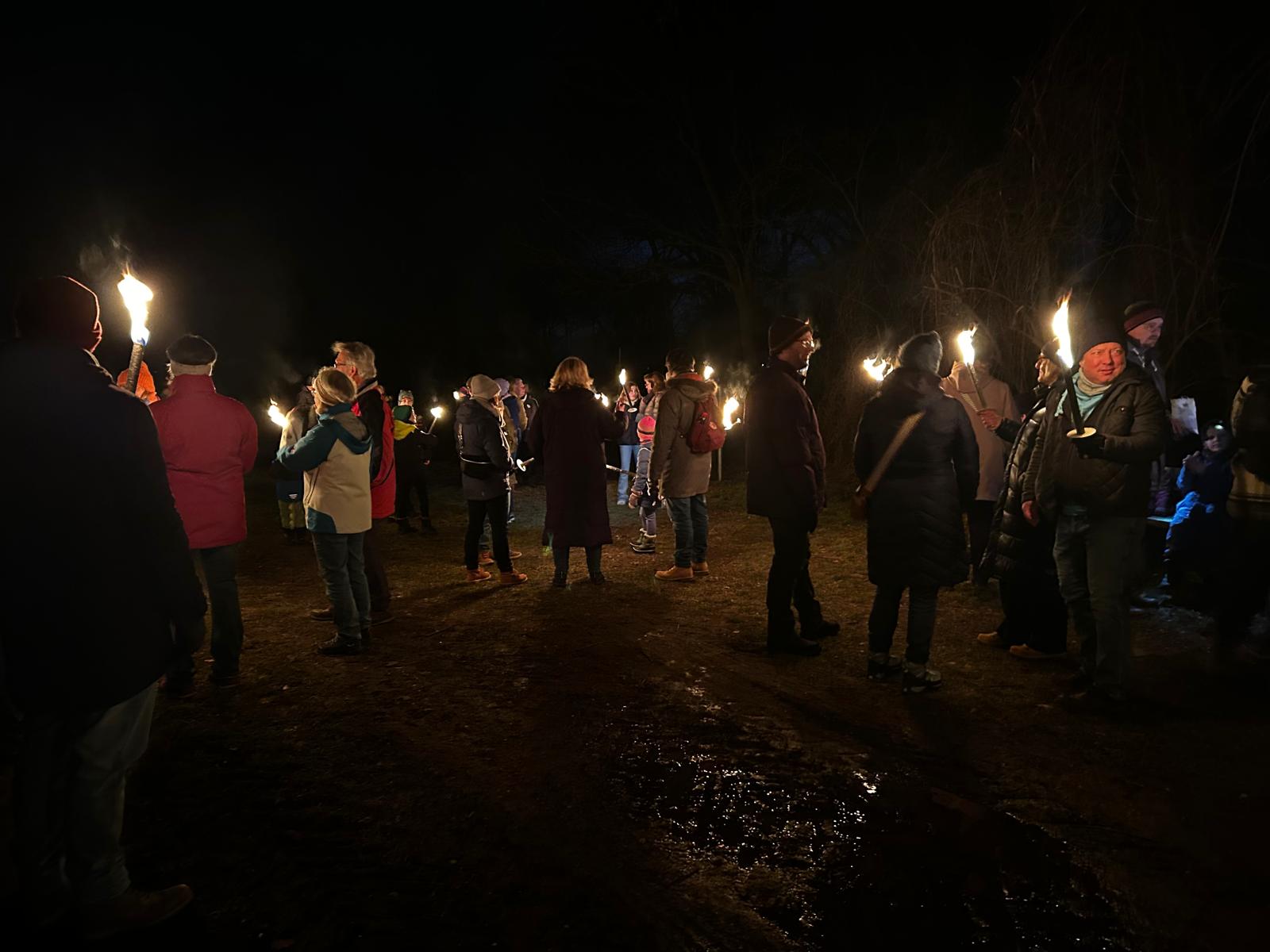 Treffpunkt war um 18:00 Uhr und nach Eintreten der Dunkelheit sind die rund 60 Teilnehmer gemeinsam mit Fackeln bewaffnet eine kleine Runde durch die Amperauen gewandert.